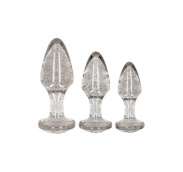 Trois plugs anaux avec paillettes internes couleur argent, fabriqués en acrylique sans phtalate ferme au toucher.
