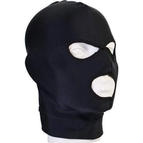 Cagoule synthétique noire, avec ouvertures pour les yeux et la bouche.