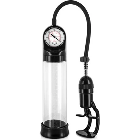 Pompe développeur pour pénis Blue Junker avec cylindre gradué et manomètre pour observer les résultats.