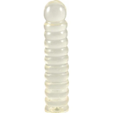 Gode translucide fabriqué dans une matière très souple, recouvert d’anneaux en relief souples.